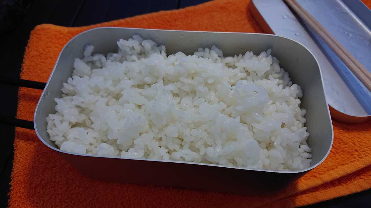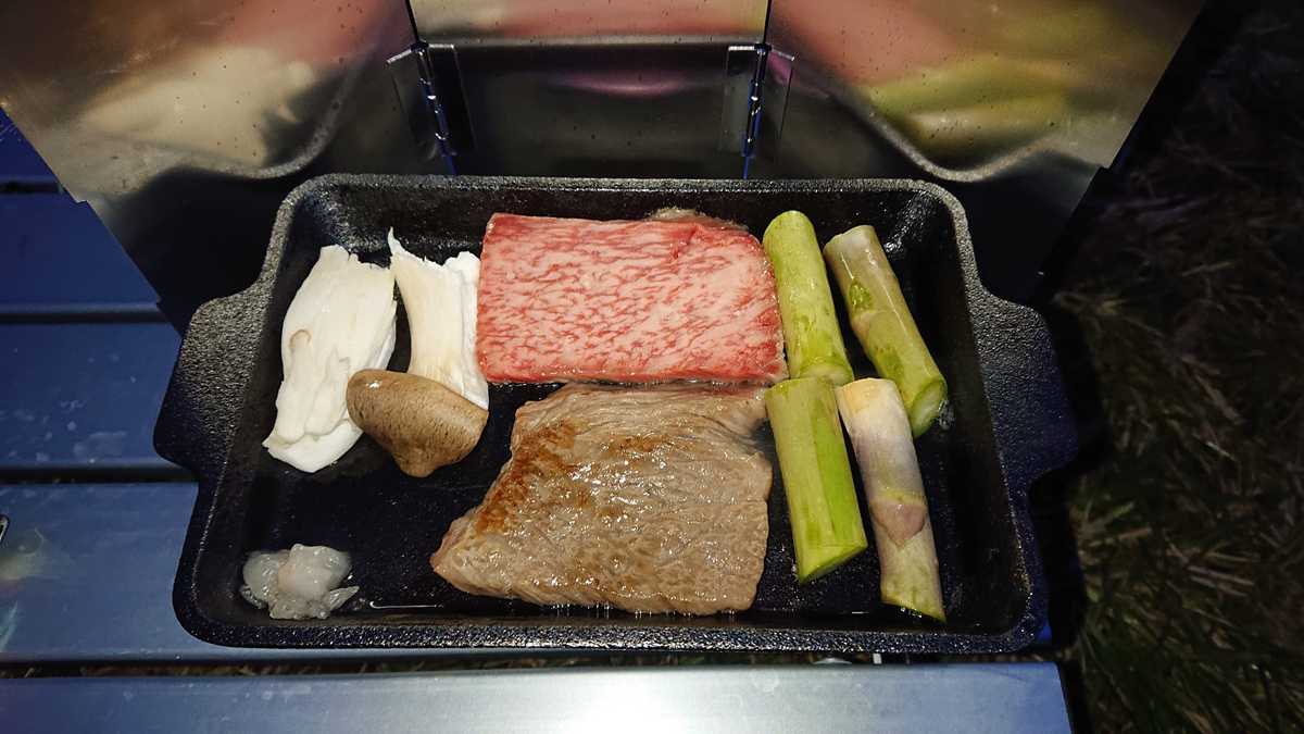キャンプだからと言って、キャンプらしいごはんを作るのは面倒なので、炭も使わずシングルバーナーで肉と野菜を焼くのみ。コメはメスティンと固形燃料でほったらかしです。